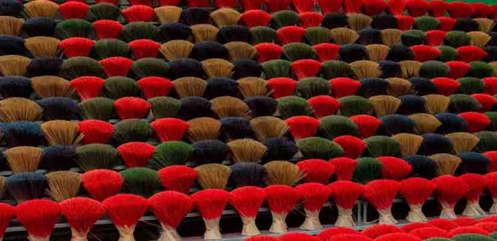 Früher war die Räucherstäbchenherstellung hier ein Nebenerwerb für Bauern in ihrer Freizeit. Heute ist die Räucherstäbchenherstellung jedoch zum Haupterwerb geworden und bietet vielen Menschen in der Region Arbeitsplätze. Tausende von roten und rosa Räucherstäbchen, die in der Sonne trocknen, bieten ein unvergessliches visuelles Spektakel.
