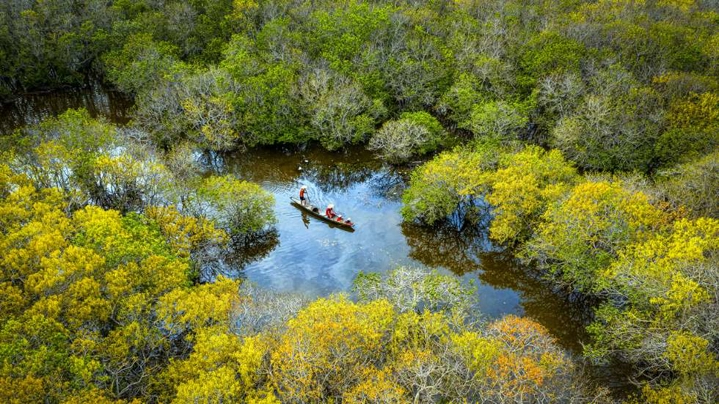Wenn Besucher die Flycam hoch in den Himmel fliegen lassen, können sie mit eigenen Augen sehen, wie der gesamte Wald in goldenes Licht getaucht wird, wenn sich die grünen Flecken der Mangrovenbäume in ein wunderschönes, leuchtendes Gelb verwandeln.