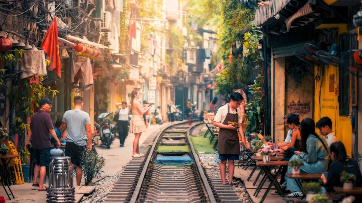 Hanoi liebt es, seine Besucher zu überraschen, sie von Überraschung zu Überraschung zu führen, von Cafés mit unwahrscheinlicher Dekoration bis hin zu winzigen Tempeln am Ende einer vergessenen Gasse, bis hin zu dieser engen Straße, gesäumt von winzigen Cafés, durch die zu festen Zeiten ... ein Zug fährt. Das Leben in der Gasse wird so durch das Ritual, dem Zug Platz zu machen, rhythmisiert, wodurch alle Aktivitäten unterbrochen werden.